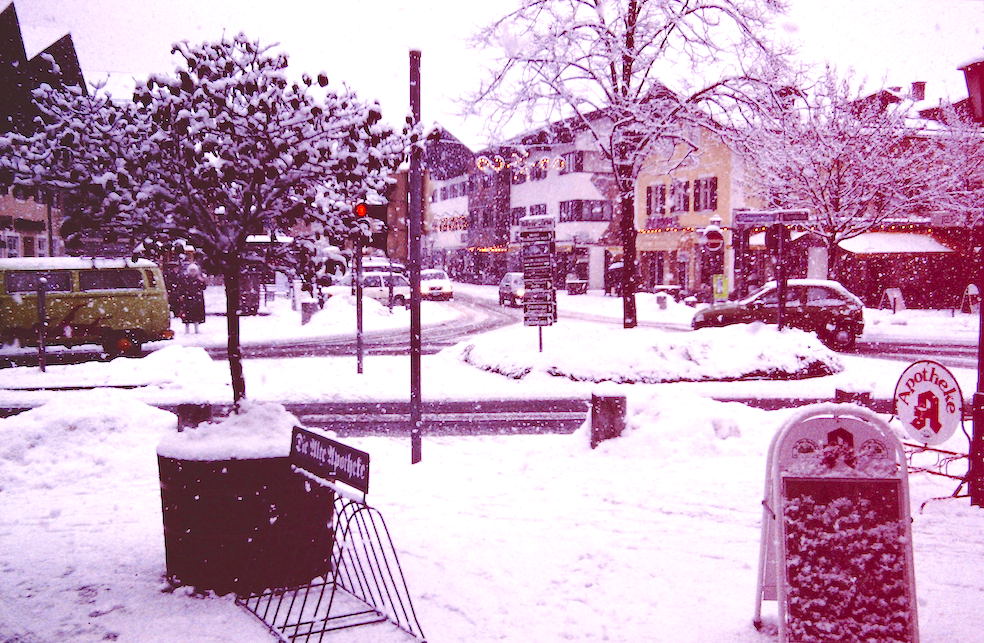 We left at about 16:00 p.m. for Garmish-Partenkirchen in the Alps south of München where we would stay for the evening. We arrived in the snow at dark and I found a nice place in Barry’s book where we could stay. We stayed at the Hotel Hilleprundt which was moderately priced and was more of a Gasthoff of the the chalet style.
