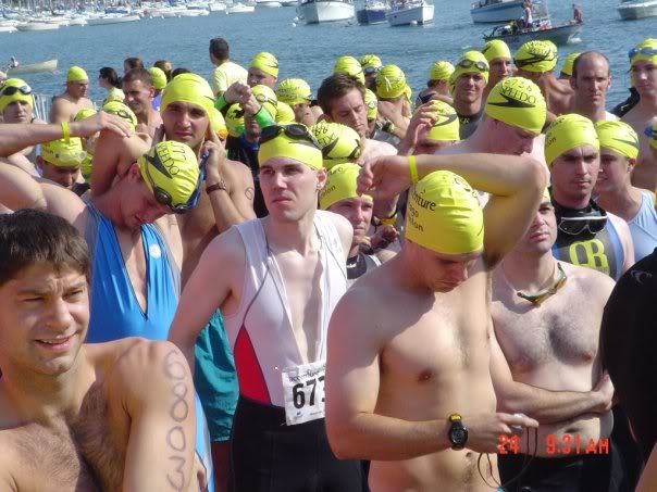When I jumped in, the water temperature in Lake Michigan took my breath away for about 15 seconds. I knew I would warm up eventually during the swim, but I knew I would be cold at first. Very few were not wearing wetsuits. The thing that surprised me the most was the pushing and jockeying for position before the start. Eventually, I just decided to get out of the way and get towards the back.