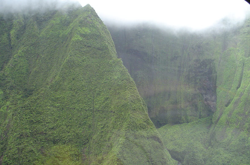 The one-hour tour took us counter clockwise around the island. We passed along the coast venturing over the Waimea Canyon, “the Grand Canyon of the Pacific.” Then we traveled up to the towering mountains of Mt. Waialeale and Mt Kawaikini, both around 5,200 feet. Among the lush greenery hugging the mountains, towering waterfalls cascaded like bridal veils to the valley below in the rain forest. The east side of Wai’ale’ale is one of the wettest spots on earth, with an annual average rainfall of 460 inches.