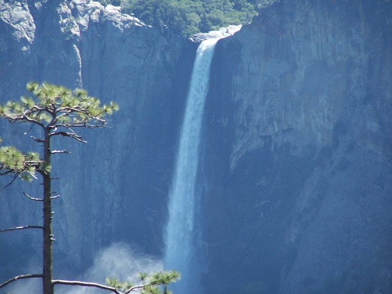 We could stay all day at this spot, so after the obligatory photos, we drove down to the valley. We stopped at a parking lot to hike up to Bridalveil Falls. We drove past Cathdral rocks on our right as the Merced River roared with high water to our left. When we reached the Yosemite Valley main area, we headed for the Ahwahnee Hotel. I had been by this historic icon before, but had never been inside.