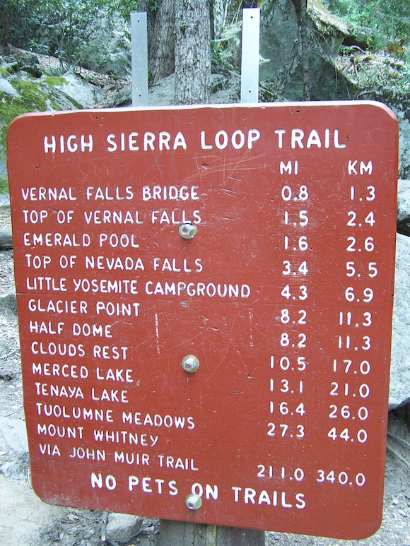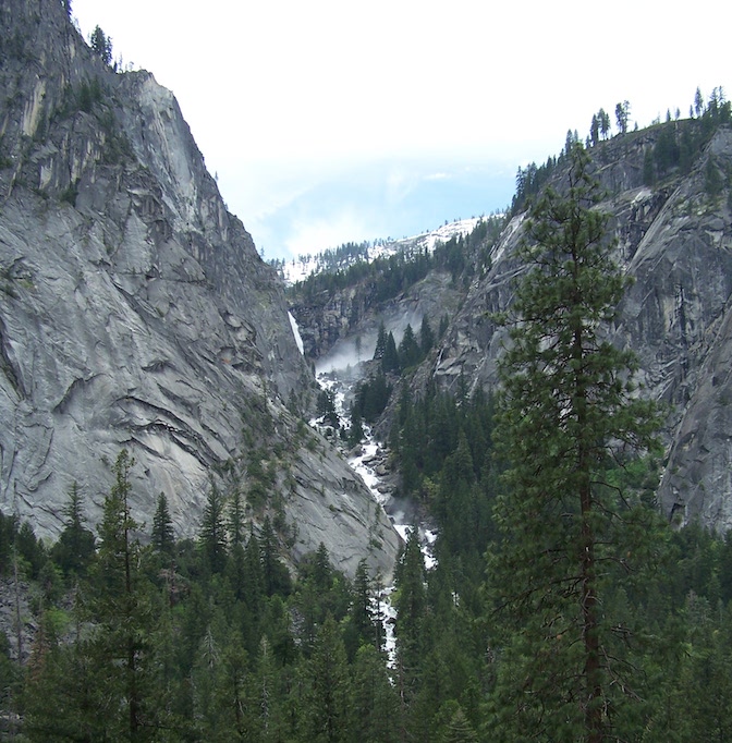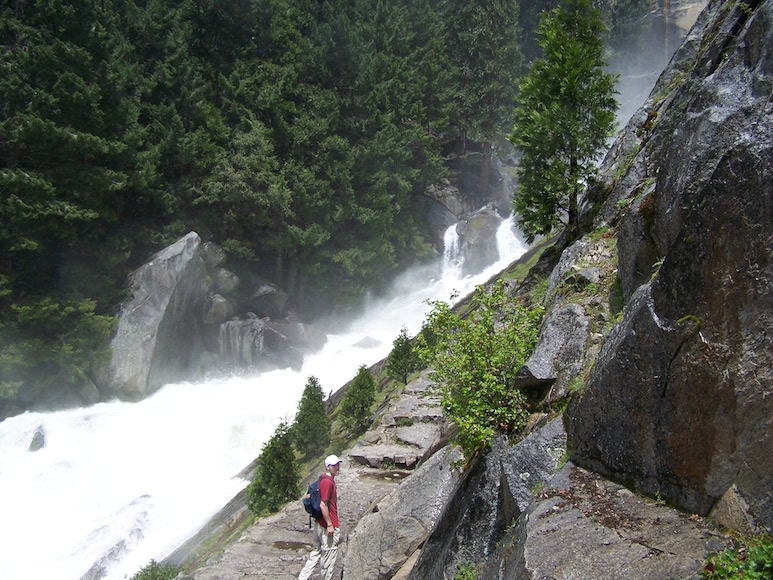 A little further, we took the split on the Mist Trail where it got steeper and we walked through a granite stairway of 600 steps to get to the top. Vernal Falls had significant power from the heavy snows and the mist was like rain as we approached. We had to put our raingear on, but still got wet. The view from the top of the 317-foot waterfall was beautiful. Some incredibly stupid people were swimming in the small Emerald Pool near the top. Almost every year, a number of visitors die here swimming above the falls.