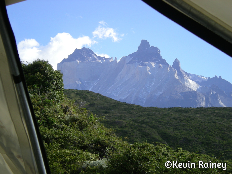 This morning as I woke up and opened the tent door, I was astounded to see Paine Grande towering above us as it peeked through fast moving clouds. This was going to be a great day!