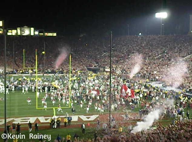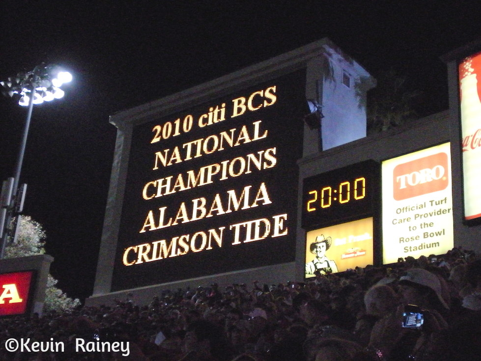 After walking around the stadium, Dad and I lined up to enter the tunnels. It took a while to enter, but I cannot describe how extraordinary it was entering the stadium. We were in the west end zone and sitting mostly with Alabama fans. We heard more than a few say “I cannot believe were at the Rose Bowl.” SEC teams had been basically excluded from the Rose Bowl since the 1940s when the bowl started to match up PAC-10 and BIG-10 teams. This was an incredible match up because it could only happen for the BCS National Championship. Alabama had a stellar record at the Rose Bowl, where they had established their tradition as a football power and the first from the South in the early 1900s. It’s immortalized in the “Yea Alabama” fight song with the words “Remember the Rose Bowl will win then” and “Dixie’s football pride.”