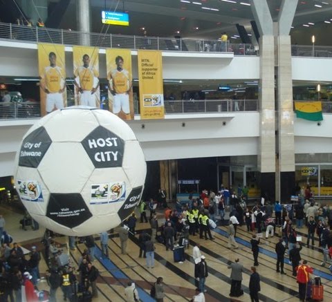 Upon arrival at customs in Joburg, Jeff and I picked up our bags and went to the ATM to withdraw some South African Rand. We couldn’t believe how nice the airport was. The airport had recently been significantly upgraded as the city hosted the World Cup only last month. In fact, a huge soccer ball and other futbol signs still hung in the dome of the main terminal. A new light rail line, called the Gauteng, linked the airport with Joburg’s financial district.