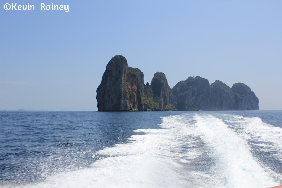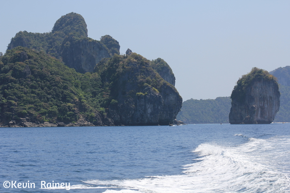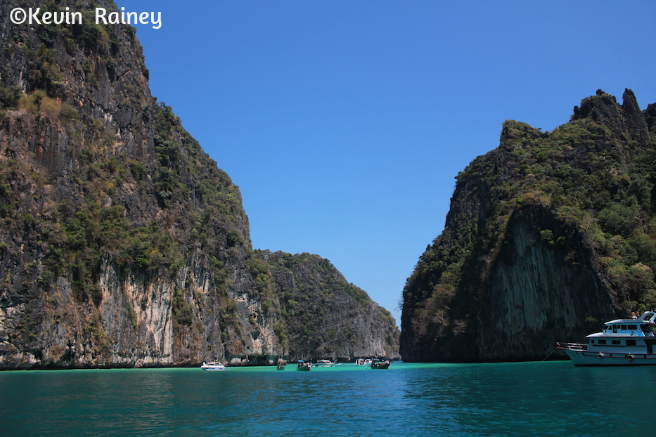 Koh Phi Phi Ley is made up of a ring of steep limestone hills surrounding two shallow bays, the Maya Bay and Loh Samah. There is also one large shallow fjord like inlet called Pi Ley with a small coral reef at the entrance. We started here at Pi Ley Bay. Pi Ley rests on the opposite side of Phi Phi Leh from Maya Bay. It’s one of the most dramatic sailings I have ever experienced as we cruised up the long and thin bay with 300-foot-high cliffs on all sides. The sun and shadows danced behind the cliffs making for interesting vistas as we passed through. The shallow and clear water offered us some excellent snorkeling as we jumped off the boat. I saw bright parrot fish and sergeant majors curious about us in the water. I fed them some bread and banana right out of my hands!