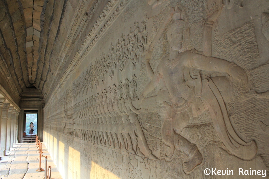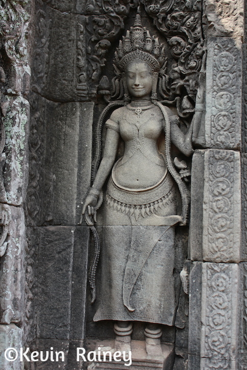 It was easy to see why Angkor Wat is one of the eight wonders of the world. One highlight for me were the beautiful bas-reliefs murals and devatas adorning Angkor Wat’s walls. I was not expecting to see such intricate detail and Richard explained some of the meanings. He also pointed out numerous plaster and structural repairs that the French carried out to help preserve the galleries. I also climbed into the temple and talked to a monk near the Buddha shrine. It was a very peaceful place to visit.