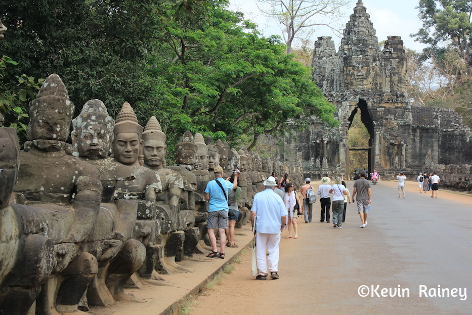We drove past the Victory Gate, about 500 meters north of the east gate. The faces on the 23-meter towers at the city gates, which are later additions to the main structure, are modeled after those on the Bayon. When we arrived at the central temples of the Bayon, I marveled at the amazingly carved faces decorating the temples. The smiling faces seemed to welcome visitors back to a previous era when the Khymer empire was at its zenith. After touring the Bayon we headed towards the south gate, the most famous gate and main entrance to the city for tourists.