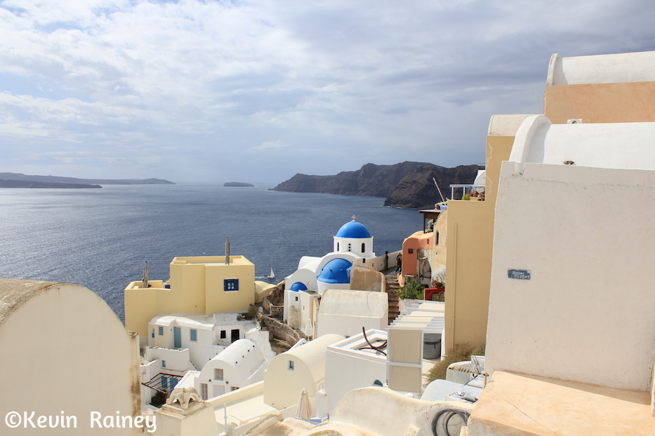 About 30 minutes later, we arrived in the picturesque town of Oia. We were completely seduced by its narrow cobblestone streets and blue-domed churches. Most of the white-washed churches were actually small chapels, and actually adjoined the property of quaint white houses overlooking the bay. We took a number of photos, and even with the clouds and a light drizzle, the landscape was fantastic. Jeff and I split a hamburger for lunch to hold us over until dinner.