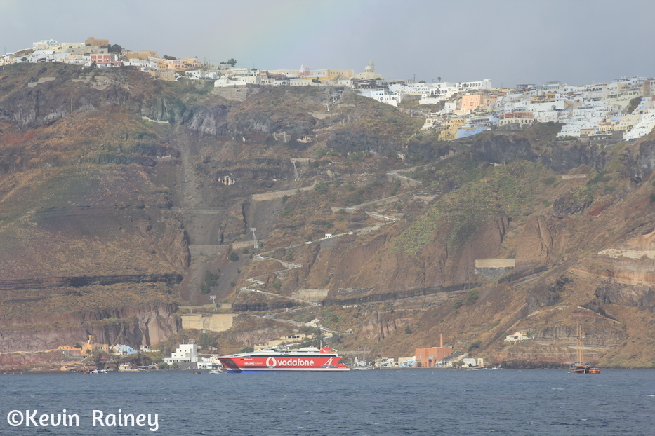 Geologically speaking, Santorini rests on the eastern ridge of what was once a larger island. Santorini forms what looks like a crescent with the remainder of the former island across the bay separated by the Aegean. In about 2,500 B.C., one of the largest volcanic eruptions of all time blew in the bay where our Wind Surf was anchored today. The walls of the island, that formed the crater, collapsed as the Aegean Ocean poured into the former crater. The blast destroyed Akrotiri and caused a huge tsunami that many believe destroyed the Minoan civilization in Knossus, Crete. Also, some believe the lost civilization of Atlantis may have been destroyed by the eruption.