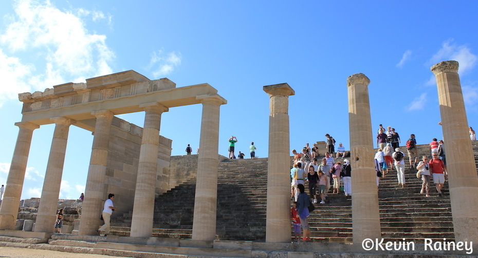 Not long afterwards we arrived in the picturesque town of Lindos, an important archaeological site for the nation. To begin our two-hour visit to Lindos, we split up today. Mom and Dad did a tour to St. Paul’s Bay, where the Apostle Paul landed in 51 AD to preach Christianity to the Rhodians. Jeff and did the more active walk up to the summit of the Acropolis of Lindos. Some people chose to ride a donkey up the climb, but that would have been too easy. At the top, I drank in the bluest waters I have ever seen as they teased us below the ancient Greek city. Many painters have been inspired by this view for generations. Below the Acropolis, we saw the old, whitewashed houses and narrow streets winding down below us to the Aegean.