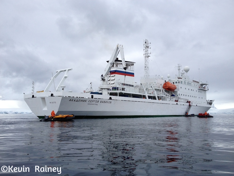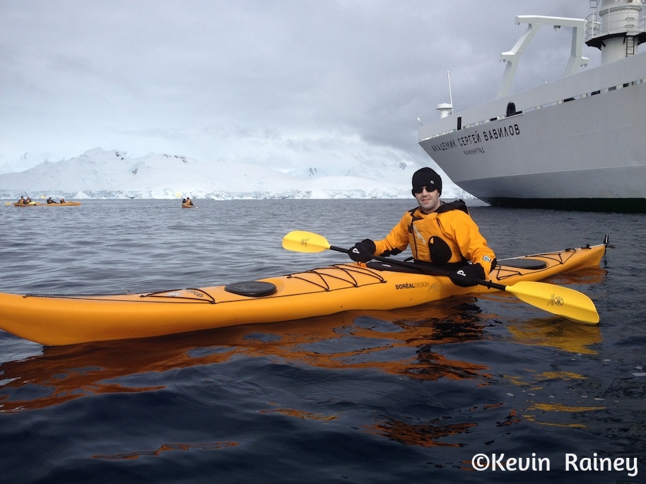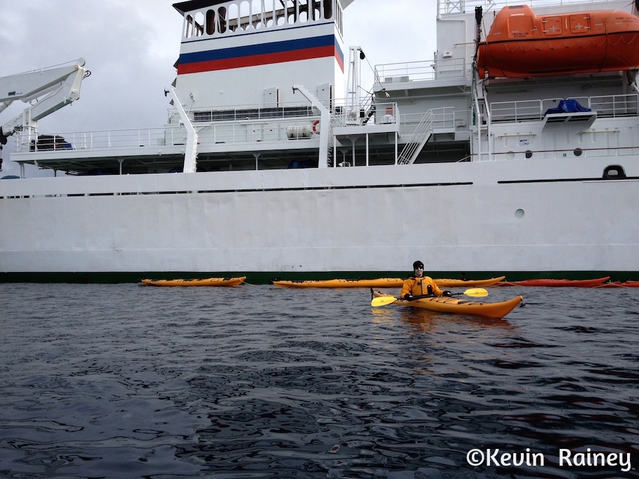 Our adventure concierge leaders positioned rubber Zodiac crafts out in the bay after being lowered by crane from our level-six deck. Jeff and I walked down the gangway where we were the first kayakers up since we were using single kayaks instead of doubles. I have never kayaked in this temperature of water before, so I didn’t want to fall in the ocean. I was a little bit nervous at first because there were some small waves in the bay, but I started to feel back at home in a sea kayak because my rudder pedals were adjusted perfectly to my legs. I paddled around and had a pretty good feel for my kayak as I waited on my guide. I also shot some video of Jeff and the Akademik Sergei Vavilov as we waited on our remaining kayakers and guides.