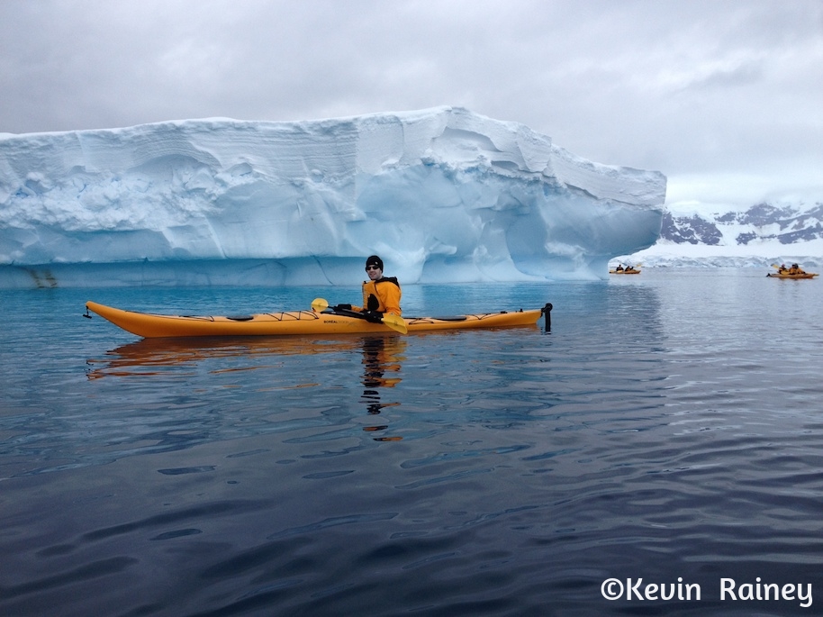 The days are definitely getting longer. The sun came up at 2:30 this morning and would stay up until 23:45 p.m.! After getting dressed, Jeff and I walked upstairs at 7 a.m. to the library for our first daily kayak briefing in Antarctica. Everyone looked bright eyed and bushy tailed about paddling this morning! Jimmy and Ian briefed us about our first paddle in Antarctica. Our fellow kayakers’ ocean experience ranged from relative beginner (less than 3 times in an ocean kayak) to more experienced. Jimmy and Ian addressed safety protocol and what to do in case of capsizing. Our dry suits would protect us for a couple of minutes, but even with them, it would be imperative to exit the water as soon as possible due to hypothermia risks.