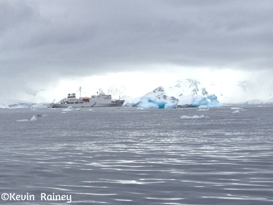 Before going on deck, we went upstairs to the dining room for continental breakfast. We enjoyed some warm food – eggs, French toast, bacon and coffee – before heading to the mudroom. There Jeff and I joined our fellow kayakers in putting on our drysuits and shoe covers before walking out on the expedition deck of the Akademik Sergei Vavilov. The temperature was about 32 degrees Fahrenheit, but felt cooler with the windchill factored in. Anchored off Anvers Island, we peered ahead at stunning Fournier Bay, almost not believing what we were seeing. It was jaw dropping looking at huge icebergs floating not far away from us off Fournier Bay as low clouds enveloped the surrounding mountains.