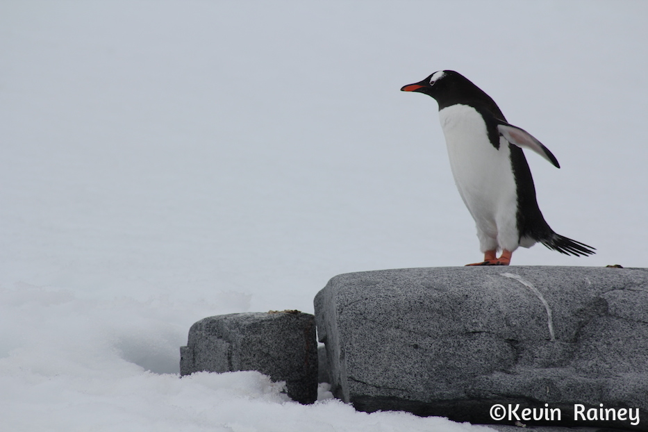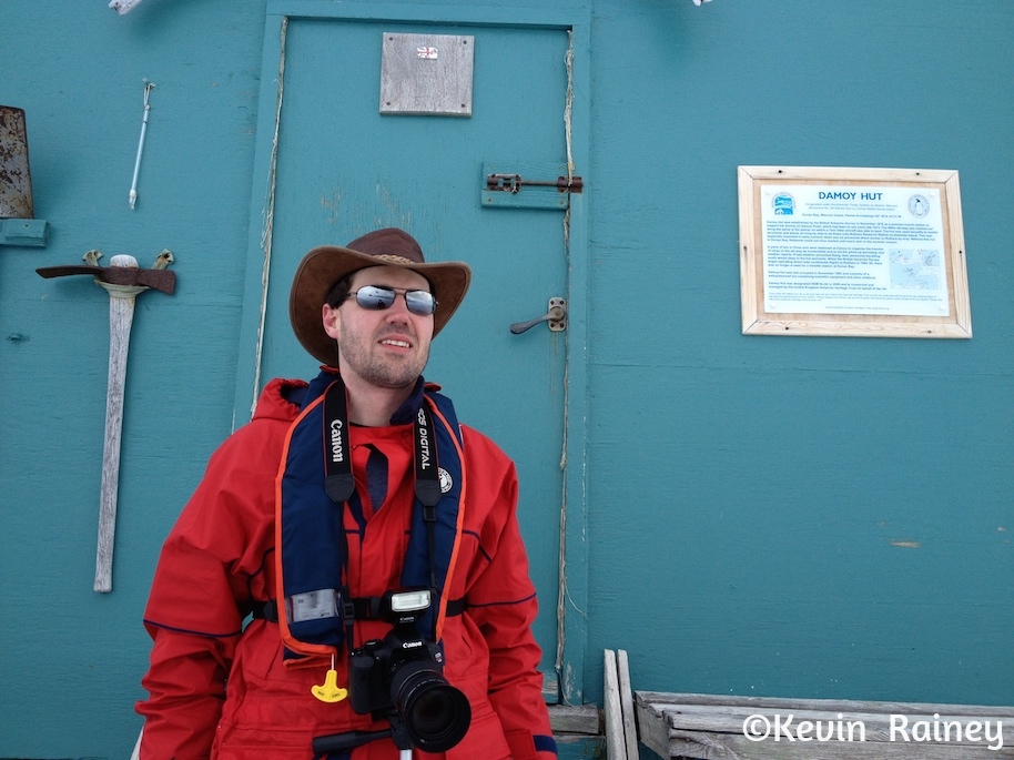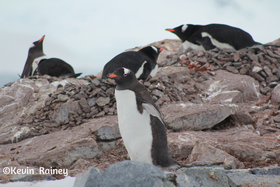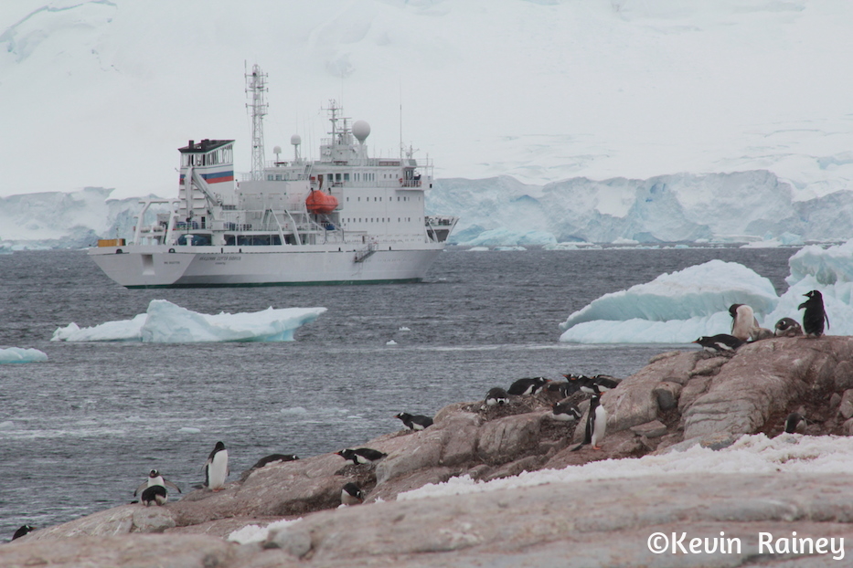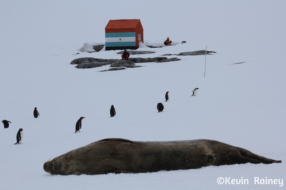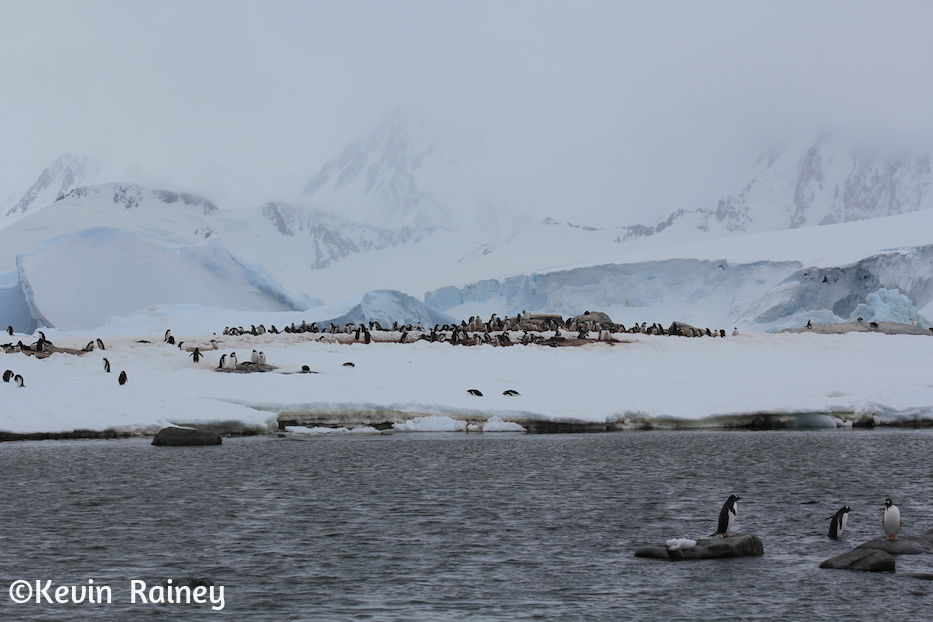 When were arrived back at the ship, our Russian crew loaded up the Zodiacs and kayaks before the Sergei Vavilov cruised onwards through the Gerlache Strait to Dorian Bay. We would be stopping for an afternoon anchoring off the coast of Wiencke Island. After lunch, Jeff and I skipped the afternoon kayak session and decided to go ashore with the Zodiac passengers to see the gentoo penguin colony at Damoy Point. This point is home to Damoy Hut, a small seasonal observation post operated by Argentina for penguin researchers. On the beach we saw hundreds of gentoo penguins eating and nesting on the snow. They are extremely social birds with each other, but a little shy around humans. You cannot get too close, but if you stand still they will walk past you.
