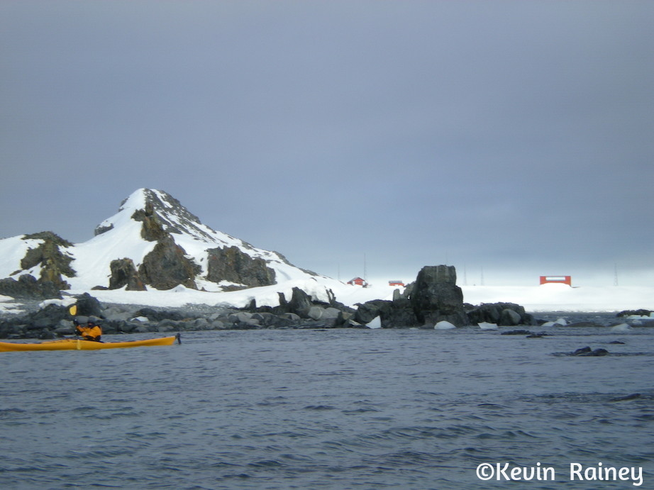 Half Moon Island is a beautiful but small island near the larger Livingston Island. We paddled past Argentina’s Cámara Base, a tiny naval station operated occasionally during the summer. We also saw a colony of south polar skuas and Antarctic terns. I saw my brother and some of the other visitors on shore hiking a trail to visit wildlife and see the surrounding mountains on nearby Livingston and Greenwich Islands. They almost look like ants in the distance.