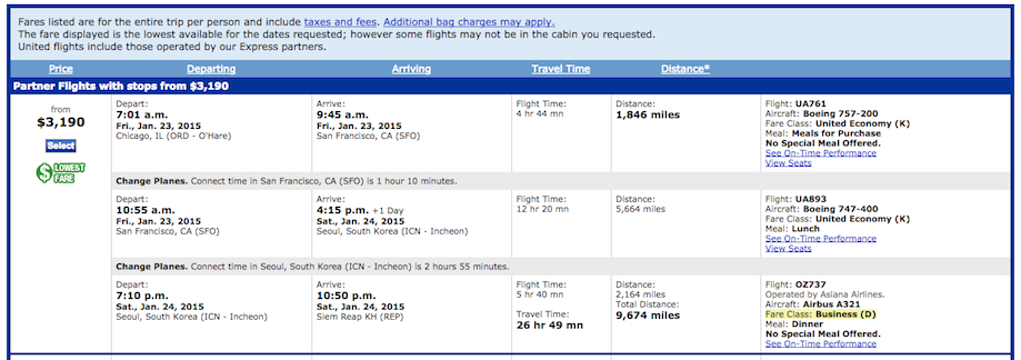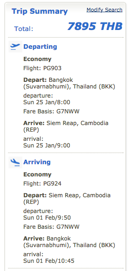 Here’s another example. Let say I wanted to visit the temples of Angkor Wat in Cambodia in a couple of months. Flying United from Chicago, it would cost $3,190. However, flying United to Bangkok and then flying Thailand’s Bangkok Airways discount airline to Siem Reap would cost $1,091 + $240 (7,895 baht), or $1,331. I could save $1,859.