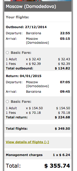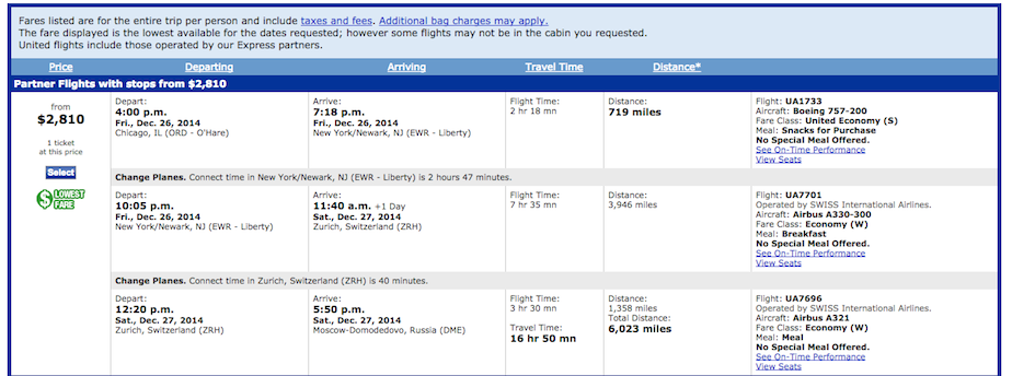 Take this example from tonight. Let’s say you were planning a trip to Moscow from Chicago on December 26 (four weeks from today) and returning on January 4. Booking this flight on United would cost $2,810. However, flying United to Barcelona and then flying Spain’s Vueling discount airline to Moscow on the same days would cost $1,711 + $355.74, or $2,066.74. That’s a savings of $743!