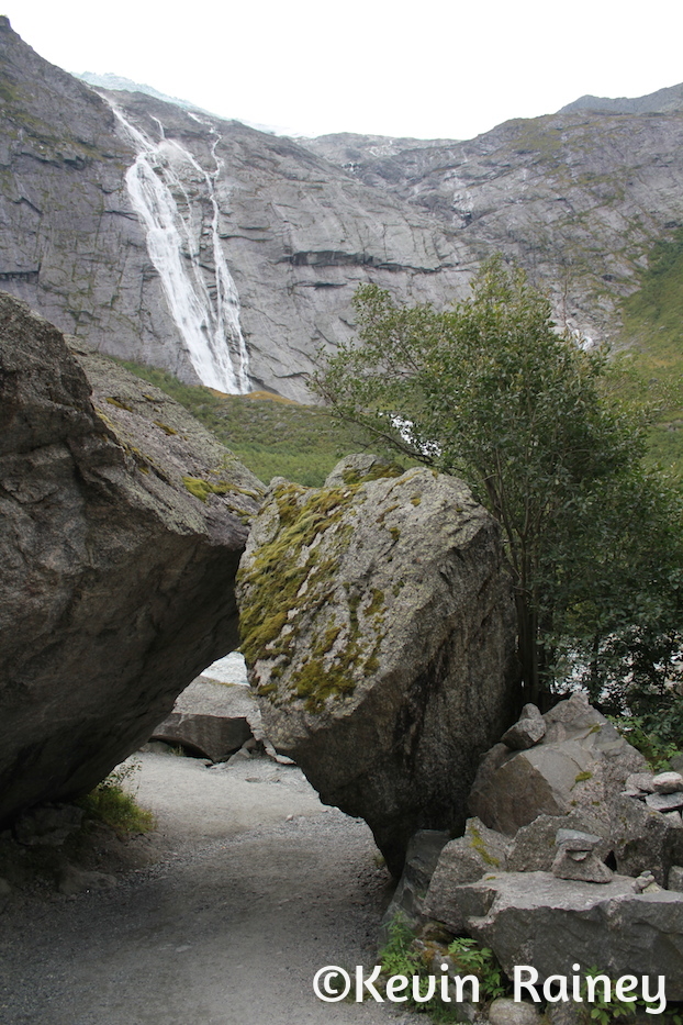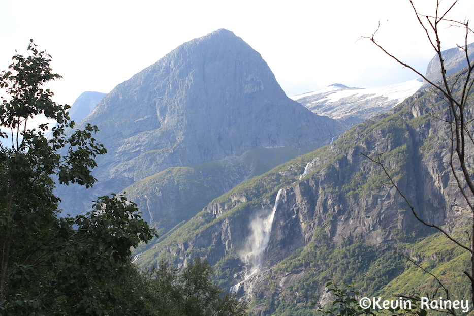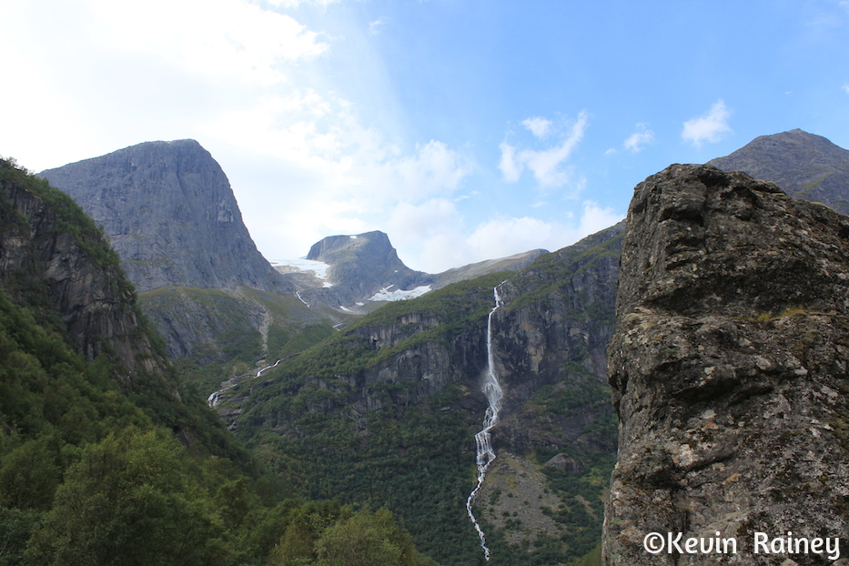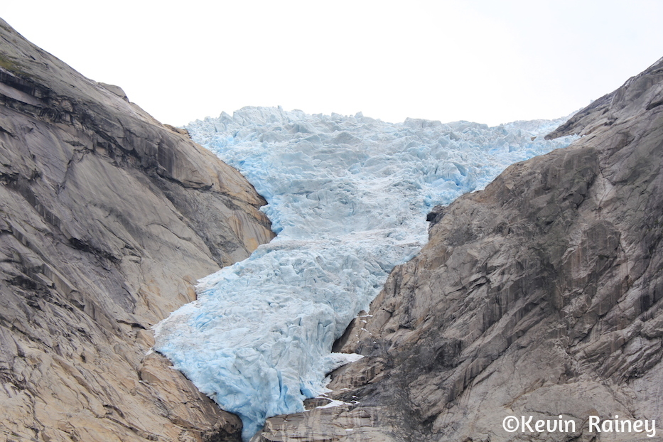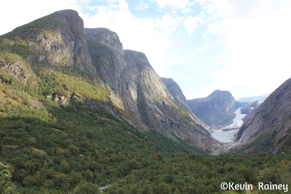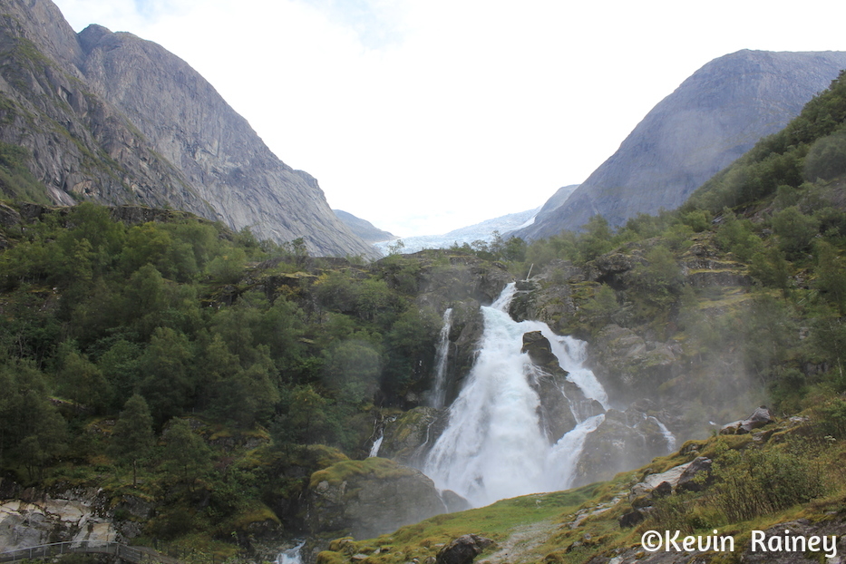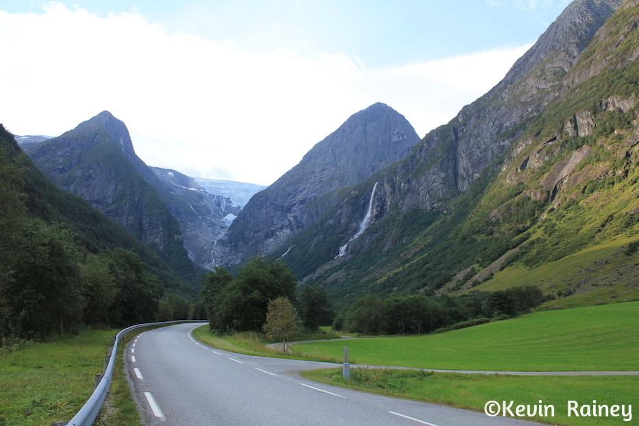 Around 9 a.m., my brother and I boarded a coach from Olden harbor which took us along the Oldeelva river into the Oldedalen valley. Our local Norwegian guide told us all about the area as we drove through the beautiful meadows. He pointed out the William H. Singer home and gallery. The famous American artist painted many renown landscapes when he lived here. During this poor period in Norwegian history, Singer also funded a road and a regional hospital for the people of Olden. Artists of the Romantic movement in the 19th century inspired travelers to come explore the dramatic landscapes here. Just like travelers of that period, we were all overwhelmed by the beautiful contrasts of the monumental peaks and glaciers towering above the rural homesteads.