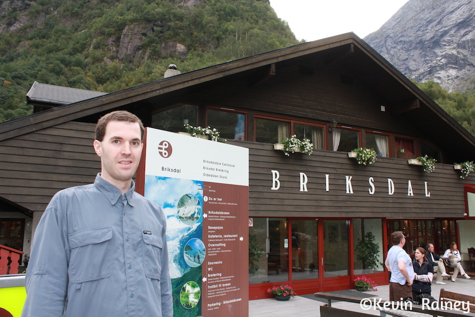 Upon return to the coach, we drove to the charming Briksdal Inn. We enjoyed a delicious two-course lunch of Norwegian salmon and dessert before touring the Nordenfjord Visitor Centre. Then my brother and I embarked on a 45-minute hike to the Briksdal Glacier.
