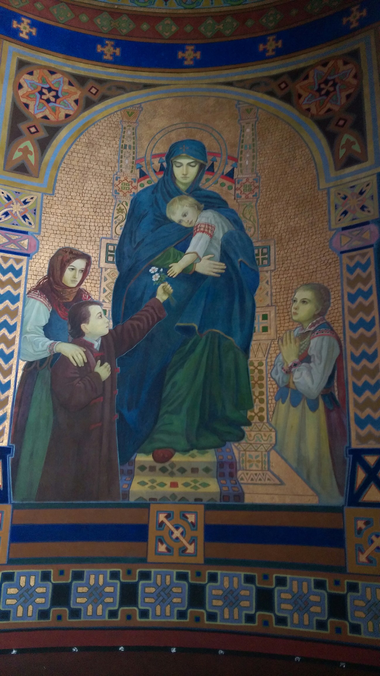 During my recent visit to the magestic Monastery of the Basilian Fathers in Zhovkva, Ukraine, the depiction of Mary diverged substantially from the paintings in western Europe. Here Mary is dressed in Ukrainian blue and gold. Her facial features are slavic, her skin is pale and her hair is blonde. It was a not so subtle but beautiful portrayal of a patriotic Ukrainian Mother of Christ.